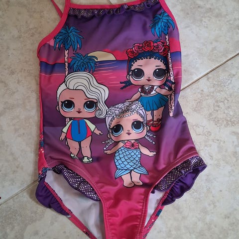 Kaksi lasten uimapukua: Mickey Mouse -tyylinen sekä oranssi kukkakuviollinen. Toinen H&M:ltä, toinen Tokmannilta. Hyvät kesän vesileikkeihin.