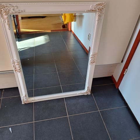 Mustaksi maalattu (alunperin valkoinen), koristeellinen peili. Ehjä ja hyvin pidetty. Materiaali puu. Melko painava.