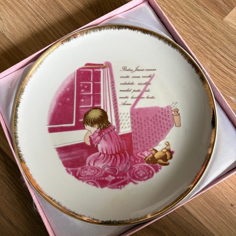 Koristeellinen metallinen seinälautanen, halkaisija 19 cm. Keskiosassa kalligrafista tekstiä. Pääväri on musta, ja kuviointi on vaaleasävyinen. Takana ripustuskoukku. Matkamuisto ehkä Turkista.