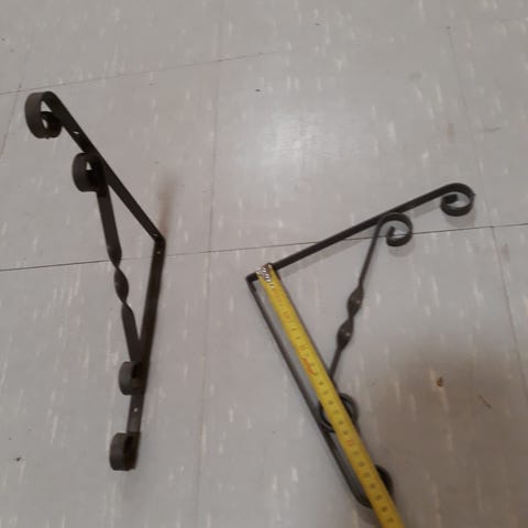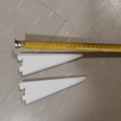 Metallisia hyllyn kannattimia 8 kpl. 29 cm kannattava pituus. En muista minkä merkkisiä, seinäkiskoja ei ole, K-raudasta aikoinaan ostettu.