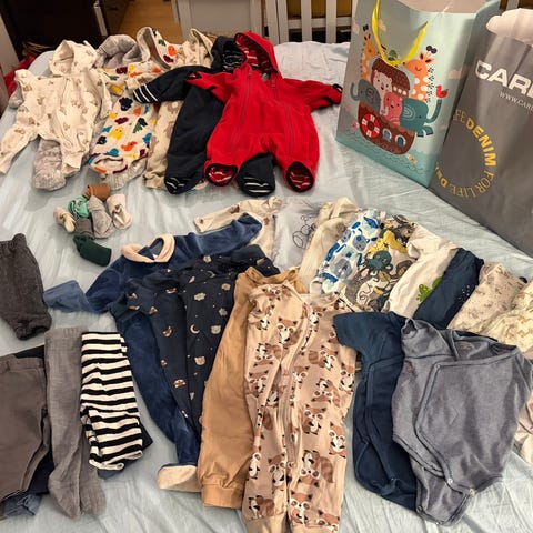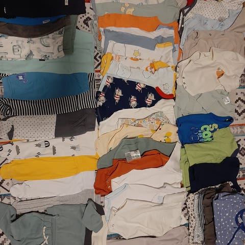 Paljon eri vauvan vaateita, jotkut ei ole edes käytetty, bodyt , pyjamat, haalarit , housut , sukat, kaks unipussi