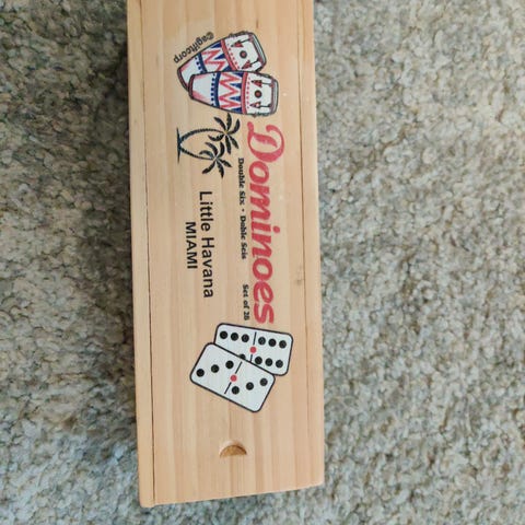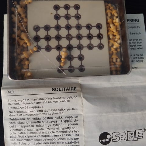 Domino lautapeli, jossa muoviset mustat nappulat valkoisilla pisteillä. Peli sisältää perinteiset dominopalikat ja alkuperäisen sääntöpaperin suomeksi ja ruotsiksi. Soveltuu useamman pelaajan numeropeliin ja pisteiden yhdistelyyn. Pakattu suorakaiteen muotoiseen koteloon, jossa erillinen alusta nappuloille.