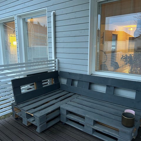 Pehmusteet hyvässä kunnossa, hieman haalistunut auringossa mutta ei pahasti. Jonkun verran sietävät vettä, mutta sateelta yleensä laittanut suojaan. Pehmusteet säilytetty aina lämpimässä varastossa kesän jälkeen.