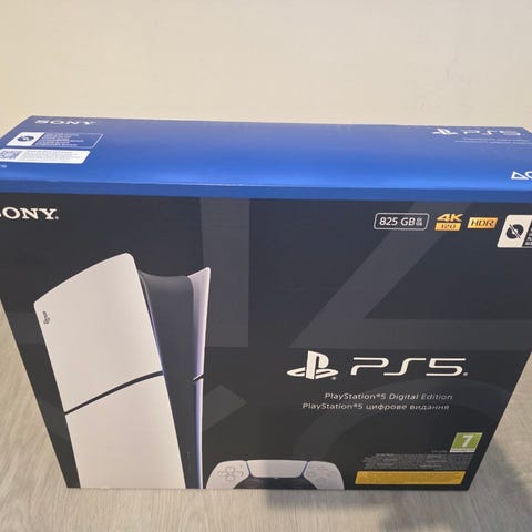 Sony PlayStation 5 pelikonsoli valkoisena. Mukana kaksi ohjainta, joista toinen valkoinen ja toinen musta, sekä USB-kaapeli ohjaimen latausta varten. Ostettu 3/2025, toimii moitteettomasti