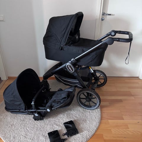 - Sisältää: runko, vaunukoppa, ratasistuin, sadesuoja, hyttysverkko, päivänvarjo, turvakaukalo adapteri (Besafe / Maxi-Cosi)