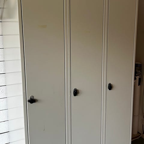 Käytetty, kuivassa sisätilassa ollut pukukaappi. Yhden kaapin sisämitat: K 170 L 30 S 49 cm.