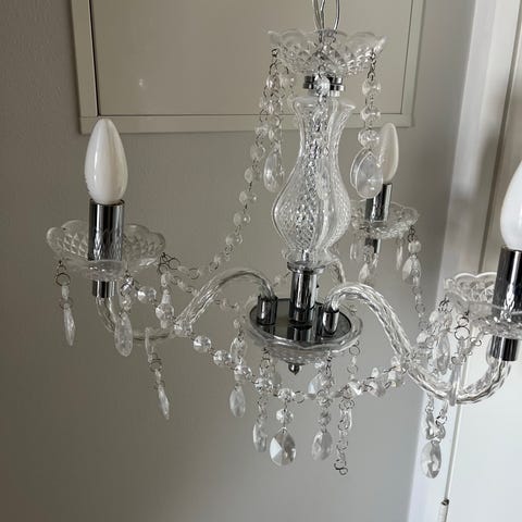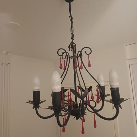 Metallinen kattokruunu, jossa useita kynttilälamppukantoja ja koristeelliset koukeromaiset varret. Kruunussa on lasisia riipuksia ja helminauhamaisia koristeita.