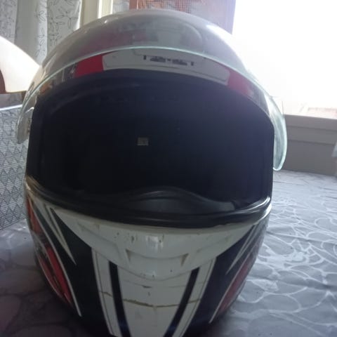 MDS umpikypärä moottoripyöräilyyn. Kypärässä kirkas visiiri ja punamusta-harmaa graafinen kuviomaalaus. Koko S.