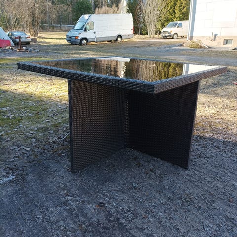 Kuudelle tuolille sopiva terassiruokapöytä, runko on mustaa polyrottinkia, pöydän kansi on jaettu useaan lasilevyyn. Pöydän lasissa naarmuja, ei vaikuta käyttöön ja näkyy tietyistä kulmista. Koko 190x90, korkeus 73. Nouto Pirkkala Kyösti.