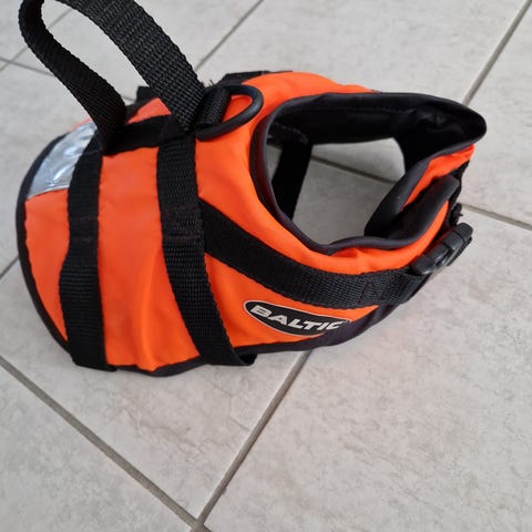 Marinepool koiran pelastusliivit. Tuotetiedoissa ilmoitetaan, että "S-koon liivin soveltuvuus/pituus: 0—8 kg / 23 cm. Liivin ilmoitettu pituus on selkäpuolisen osan pituus." Ollut käytössä n. 5 kg villakoiralla. Kunto erittäin hyvä, tarkkaan katsoessa oranssissa osassa paikoin pientä värjäymää, mutta yleisilme siisti. Ei ole yritetty putsata.