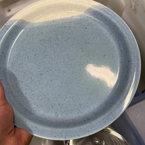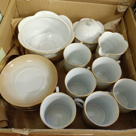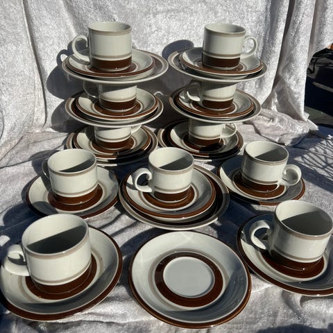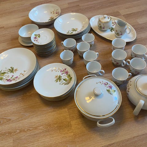 Kaunis lautassarja; kuusi matalaa ruokalautasta ja kuusi asettia, sekä sarjaan kuuluvat kaksi kynttilänjalkaa. Uudenveroisessa kunnossa, vain pari kertaa käytetty.