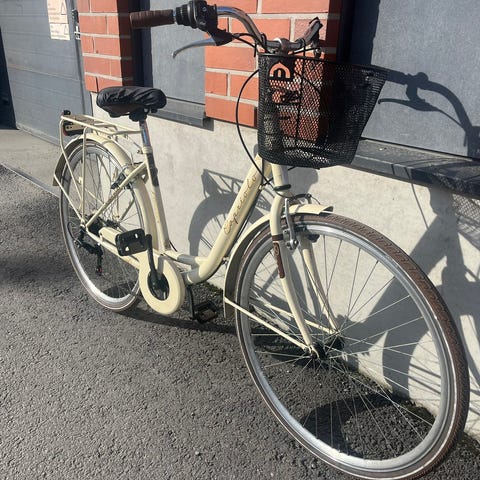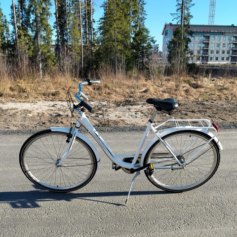 Uutena ostettu ja käyttöä on kolmen kesän verran. Kori kuuluu mukaan ja sekä etu- että takalamppu toimii pattereilla (ne täytyy itse vaihtaa).