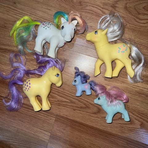 My Little Pony ponilelut, usean hahmon setti. Muovisia pieniä ponifiguureja, joilla on pitkät värikkäät harjakset ja hännät. Värit vaihtelevat, mukana mm. vaaleansininen, keltainen ja valkoinen poni eri harjaväreillä. Sopii leikkeihin ja kokoelmiin My Little Pony -teemasta pitäville lapsille. Mukana myös peili. Settinä 10€. Nouto Helsinki Kannelmäki tai postilla. Katso myös muut kohteeni.