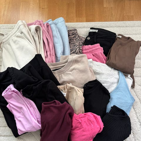 Kasa hyväkuntoisia naisten vaatteita S-M koossa (36-38), vain osa vaatteista kuvassa. Farkkuja, toppeja, neuletakkeja, mekkoja yms. Säilytyksestä ryppyisiä.