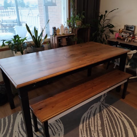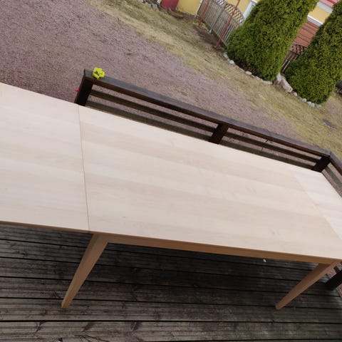 Kohtalaisen hyväkuntoinen pöytä, muutama naarmu löytyy korkeakiiltopinnasta mutta voi laittaa pöytäliinan tai tabletteja. Tuolitkin ihan ok mutta keinonahkapinnassa jo vähän kulumaa paikoitellen. Nouto Naantali
