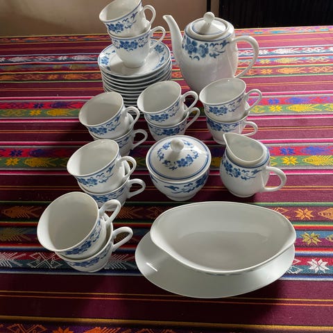 Myydään kuvassa oleva kaunis kukkakoristeinen kahviastiasto. Kiinalainen. Käyttämätön. Vaikka kesämökille. Setti sisältää 6 isohkoa kahvi/teemukia, 6 tassilautasta ja 6 pientä lautasta. Kaikki samaa sarjaa ja myydään yhteishintaan.