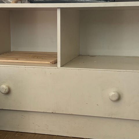 Pieni valkoinen lipasto. Mitat: k 65, l 34 ja s 31,5.