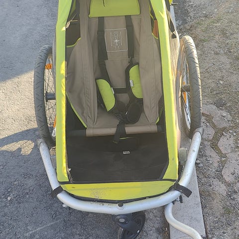 Burley pyöräkärry kahdelle lapselle. Väri punainen ja musta. Kärry kiinnitetään polkupyörään vetoaisalla. Sivuilta löytyy ikkunat ja edessä on sekä sadesuoja että hyttysverkko. Sisällä on useita turvavöitä lapsille sekä taskuja pientä tavaraa varten. Takana on heijastimia näkyvyyden parantamiseksi. Pyöräkärry sopii lasten kuljettamiseen pyöräillessä ja siinä on tilaa myös pienelle määrälle tavaraa istuintilan takana. Aurinkoon haalistunut värejä, joten laitoin kuntoluokitusta alaspäin. Teknisesti aivan kunnossa. Etupyörän ansiosta voidaan käyttää myös rattaina.