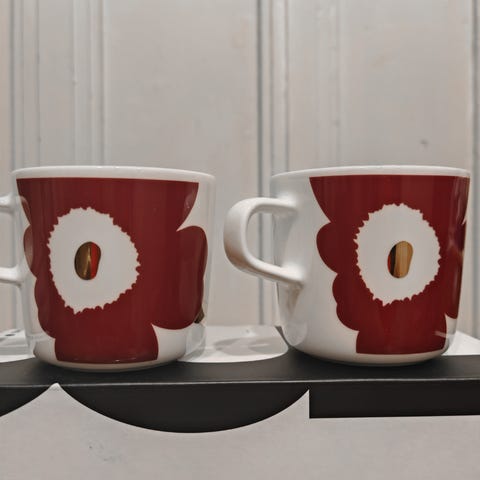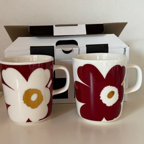Uudet vaaleanpunaiset Marimekko Unikko juhlamukit. Unikon keskusta kultainen.