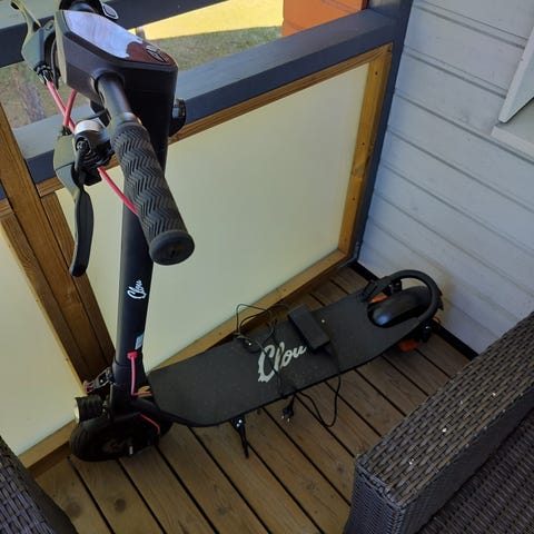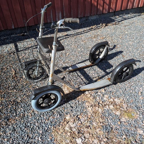 Eslan potkulauta, jossa etukorilla varustettu ohjaustanko ja kello. Suuret, ilmakumirenkailla varustetut pyörät edessä ja takana. Pyöriin on vaihdettu sisäkumit. Runko on irroitettava helpompaa kuljetusta varten. Potkulaudassa on jalkatuki pysäköintiä varten sekä lokasuojat. Soveltuu kaupunki- ja pihaliikkumiseen. Maalaus on vähän sinnepäin tehty. Etukori on vähän rikki. Käsijarru edessä jumittaa tällä hetkellä (jarru jää välillä laahaamaan).
