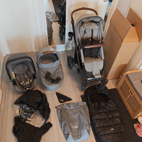 Britax yhdistelmävaunut harmaa-mustalla kankaalla. Alakori tarjoaa säilytystilaa tavaroille. Pakettiin kuuluu vaunukoppa vastasyntyneelle sekä istuinosa isommalle lapselle. Kuvissa näkyy lisäksi sadesuoja ja jalkapeite. Mukaan myös adapterit Maxi-cosi turvakaukalolle. Sijaitsee Salon keskustassa Enolassa. Eläimetön koti.