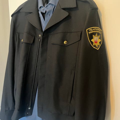 Myydään koko asu: housut, kauluspaita, takki ja päähine.