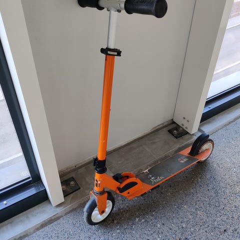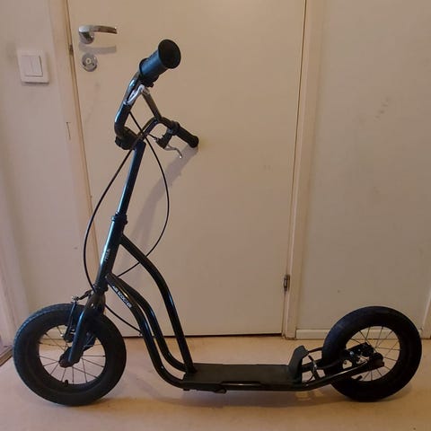 Stiga potkulauta, jossa vihreä runko ja ilmakumirenkaat edessä ja takana. Potkulaudassa on jarru takarenkaalle, leveä jalkatuki sekä pehmustettu tankosuoja, jossa Stiga-logo. Soveltuu lapsille tai nuorille käyttäjille koosta riippuen.