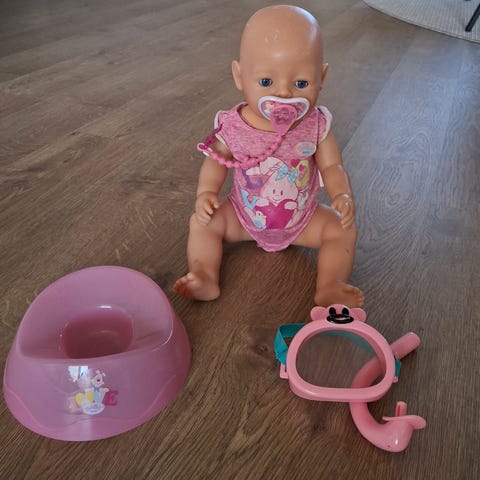 Hyväkuntoinen vauvanukke ja tarvikkeita.