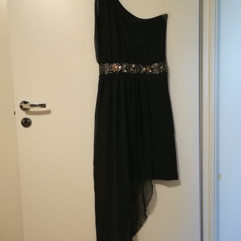Musta mekko. Koko n. L (kokomerkintä puuttuu). Merkki Jus D’Orange. Pienet olkatoppaukset. Kai-kai 48cm (venyy). Pituus n. 100cm. Mekossa on nukkaa takana (kuva 11/12 näyttää nukan kun kuva vaalennettu ja kuva 12/12 näyttää nukan lähempänä oikeaa ihmisen näkemää näkymää, eli ei näy hyvin silmälle paitsi kun katsoo läheltä). Hinta alennettu nukan takia ja kunto merkattu kohtalainen vaikka muuten mekko on hyväkuntoinen. Muutamia koristeita lähtenyt etuosan ”vyökoristeesta”.