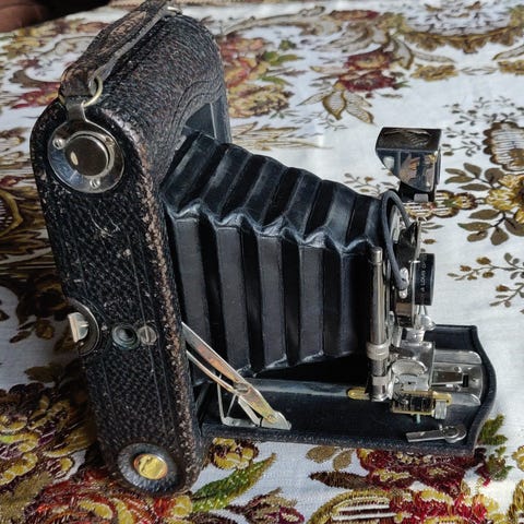 1930-luvun vanha kamera. Haitari näyttää ehjältä ja kaikki luukut aukeavat vaivatta, mutta muuten toimivuudesta tai kunnosta ei ole tietoa.