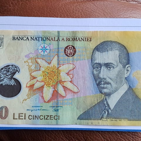 Romania, Kansallinen Pankki, 1000 Lei 1941–45Todella kaunis seteli, suunnitellut tunnetun taiteilijan Nicolae Grigorescun toimestaPick #: 52aSerial #: V.0580 0950PMG 55 EPQWmk: Trajan