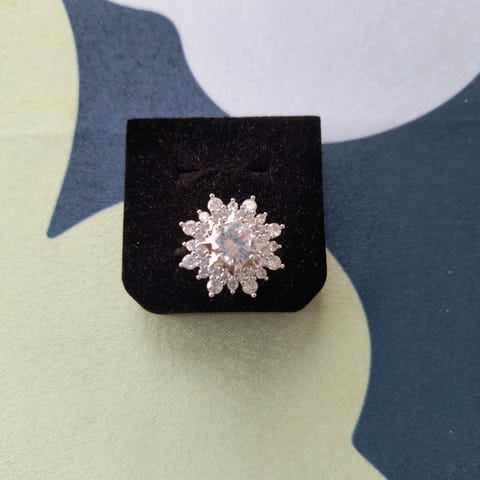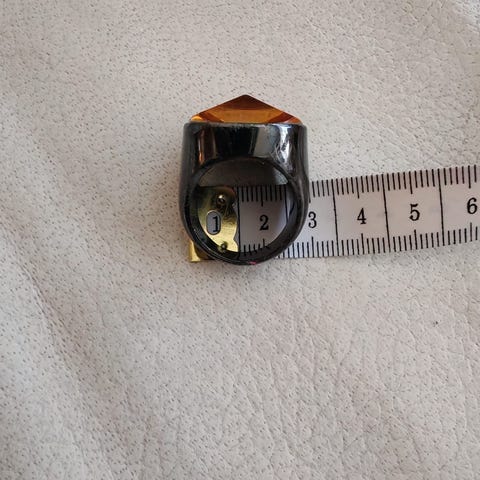 Sormus, jossa on neliönmuotoinen kivi tai koristeosa. Sormuksen koko on säädettävä, ja metalliosa on tummansävyinen. Kiven sivun pituus on noin 2–2,5 cm, kuten kuvassa näkyvästä mittanauhasta voi arvioida. Sopii käytettäväksi arki- tai juhlakoruna. Nouto Helsinki Kannelmäki tai postilla. Katso myös muut kohteeni.