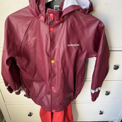 Siisti vaaleanpunainen Didriksons-sadetakki kokoa 130. Muutama pieni kuvanmukainen värjäymä. Nouto Jyskästä. Entinen kissatalous. Mmm.