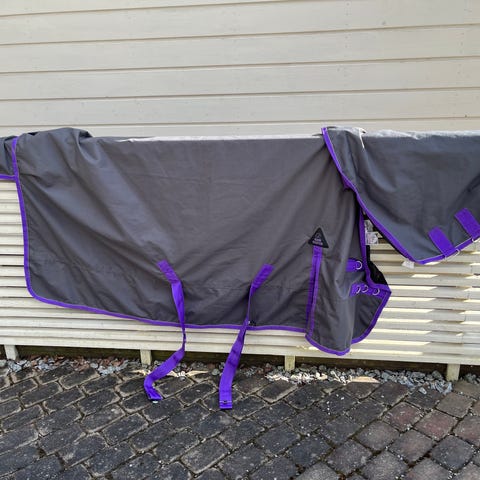 Bucas sadeloimi, koko 135cm. Ehjä loimi ja on nyt pesun jäljiltä, mutta pinttymää näkyvissä vähän siellä sun täällä. Jalkalenkit ja häntälenkki puuttuu.