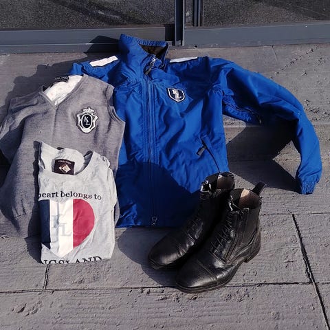 Ratsastushousut ovat samaa tummansinistä sävyä, lahkeissa ja sisäpinnoissa on joustavaa, teknistä materiaalia, joka tukee liikettä ratsastaessa. Setti sopii ratsastuskäyttöön ja tallivaatteeksi ympäri vuoden, kerrospukeutumisen osana.
