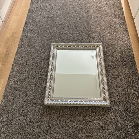 Peili koristeellisella kehyksellä. Neliönmuotoinen peili, jossa on leveä, profiloitu puukehys ja kohokuvioidut kulmakoristeet sekä reunalistat. Kehyksen etupuoli on maalattu ruskean ja hopean sävyihin, takana puurunko ja ripustusvaijeri seinäkiinnitystä varten.
