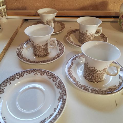 1960-luvun pienet kahvikupit, joissa on herkkä vaalean lila kukkakuvio.