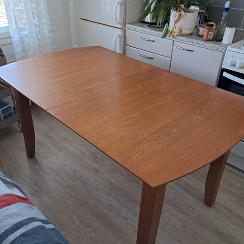 Annetaan musta ruokapöytä, Ikeasta alunperin. Muuten oikein vankka, mutta pinta kärsinyt. Ollut sisällä, parvekkeella ja viimeisen pari vuotta varastossa. Nouto Vammalan keskusta!