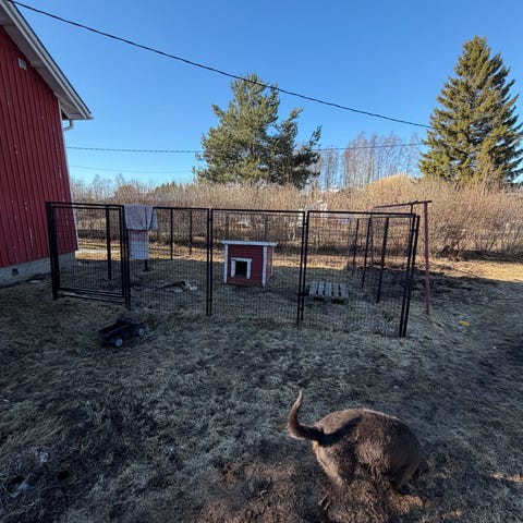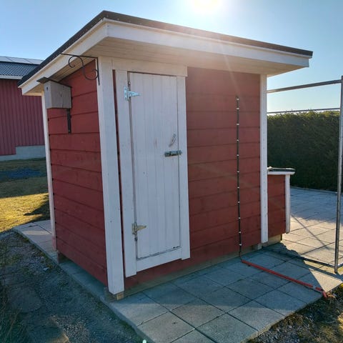 9m2 varaston kokoinen koiratalo. Yhdellä lunkalla, sekä ovi mistä voi käydä sisällä.