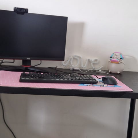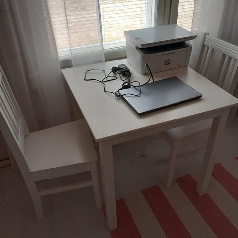 Pieni valkoinen työpöytä, yksi kiinteä alahylly.