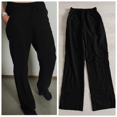 Madlady suorat housut. Mustat. Koko 34/regular. Polyesteri 98% , spandex 8%. Eivät ehtineet käyttöön.