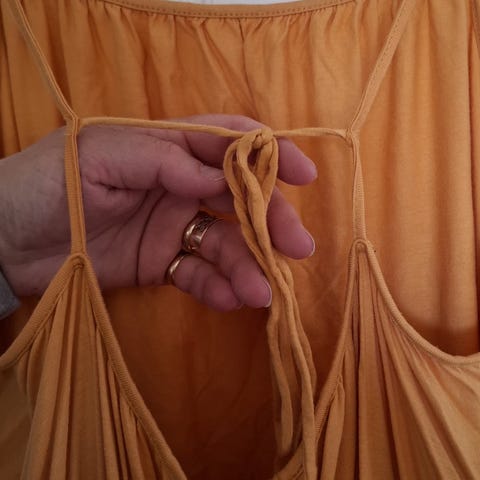 Oranssi ja täysin pitämätön mekko. Vyötäröllä lenksut, joiden avulla voi halutessaan lisätä vyön. Ilman vyötä istuvuus vyötäröltä on löysä. Toisessa kuvassa väri lähimpänä totuutta.