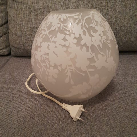Lastenhuoneen kaunis pöytävalaisin. Lampun jalka on Ikeasta. Varjostimessa ei valmistajaa. Valaisimessa mukana isokantainen filamenttilamppu.