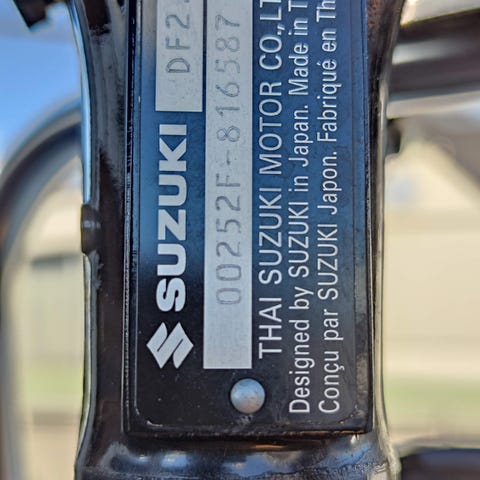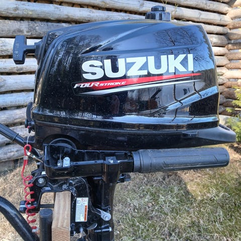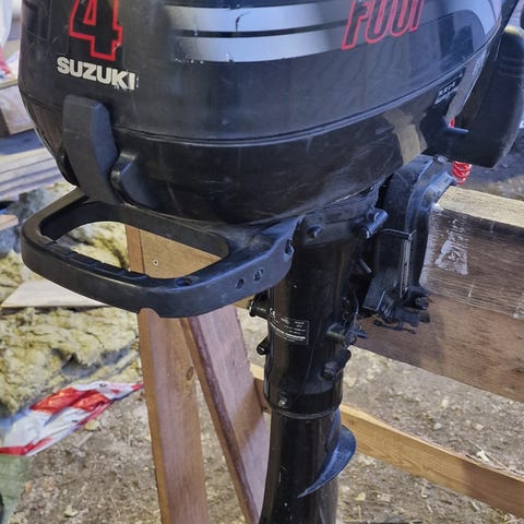 Purettu Suzuki perämoottori. Kone käynyt aikaisemmin ehkä kahdella pytyllä. Trimmi ei pitänyt kunnolla konetta ylhäällä. Perässä pelkät kuoret.
