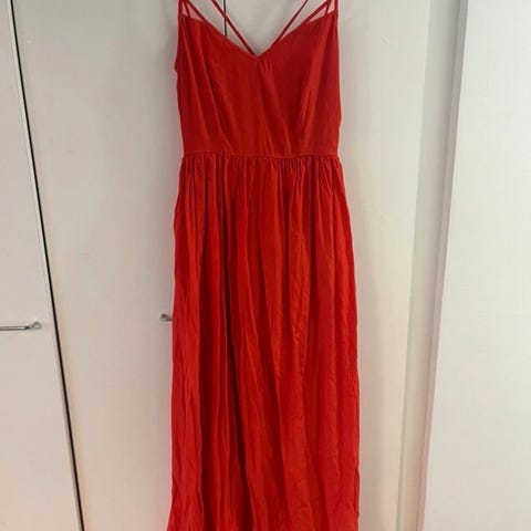 NLY-merkin juhlava ohut kesämekko. Koko 38/M. Väri vaaleanpunainen, kukkakuvioinen. Materiaali polyesteriä. Mekossa on kietaisumallinen yläosa, lyhyet läpikuultavat hihat ja vyötäröllä solmittavat nauhat. Helma on polven alapuolelle ulottuva ja alaosa on läpikuultavan röyhelöinen. Sisävuori, pitkä vetoketju takana.