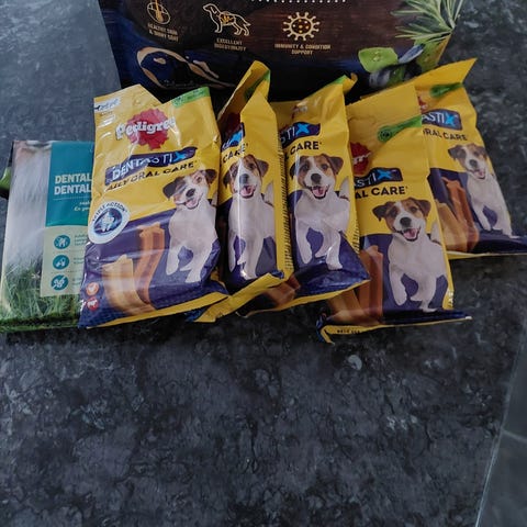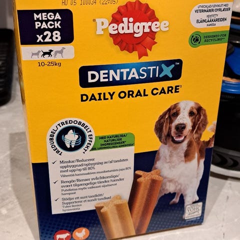 Pedigree Dentastix Daily Fresh koiran purutikut. Pakkaus on mega pack, jossa on 28 purutikkua. Tuote on tarkoitettu koirien päivittäiseen purtavaksi annettavaan hammashoitoon. Tikkujen muoto ja koostumus auttavat vähentämään plakin ja hammaskiven muodostumista. Daily Fresh -versio sisältää raikastavia ainesosia, jotka tukevat koiran suun ja hengityksen raikkautta. Soveltuu täysikasvuisille koirille, tarkoitettu suurille koirille. Parasta ennen-päiväys 22.10.2026.
