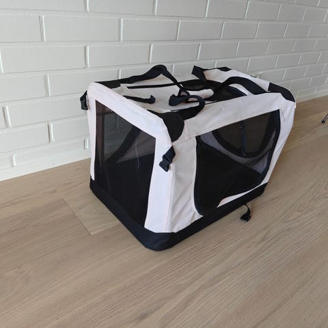 Peten koiratarvikkeen kevythäkki, koko S, turkoosi-musta, mitat n. 50 x 35 x 35 cm. Kantolaukku sopii esimerkiksi koiran tai kissan kuljettamiseen. Laukussa on vetoketjullinen verkkoluukku edessä ilmanvaihtoa ja näkyvyyttä varten. Saa taitettua kasaan. Kaksi kappaletta. Ehjät ja toimivat.