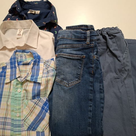 Pitkähihaiset paidat ja yksi t-paita koossa 134/140. Tulleet meille vaatepaketin mukana, mutta liian reilua kokoa jemmattavaksi. Näissä on pesuaineen tuoksua. Nopealla läpikäynnillä yhdestä löytyi tahroja (toinen kuva). En ole varma kaikkien merkistä, koska lappuja leikattu pois.