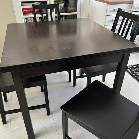 Kokopuinen jatkettava koivuinen ruokapöytä ja 6 tuolia. Kunto hyvä. Pöydällä pienet kolhut toisessa päässä, näkyvät kuvassa. Muutoin kunto erinomainen. Jatkettuna pituus 200 cm ja ilman jatkopalaa 155 cm jatkopala siis 45 cm. Nouto, jalat saa irrotettua kuljetuksen ajaksi.