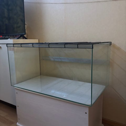 Lasinen akvaario, jossa hopeinen alumiini kehys ja läpinäkyvät sivut. Taustaseinässä on kasviaiheinen taustakuva jonka saa pois. Sopii terraarioksi. 80x40x40cm. Ollut hamsterilla. Toimitus 15km säteellä Oulun keskustasta hintaan 10 euroa.